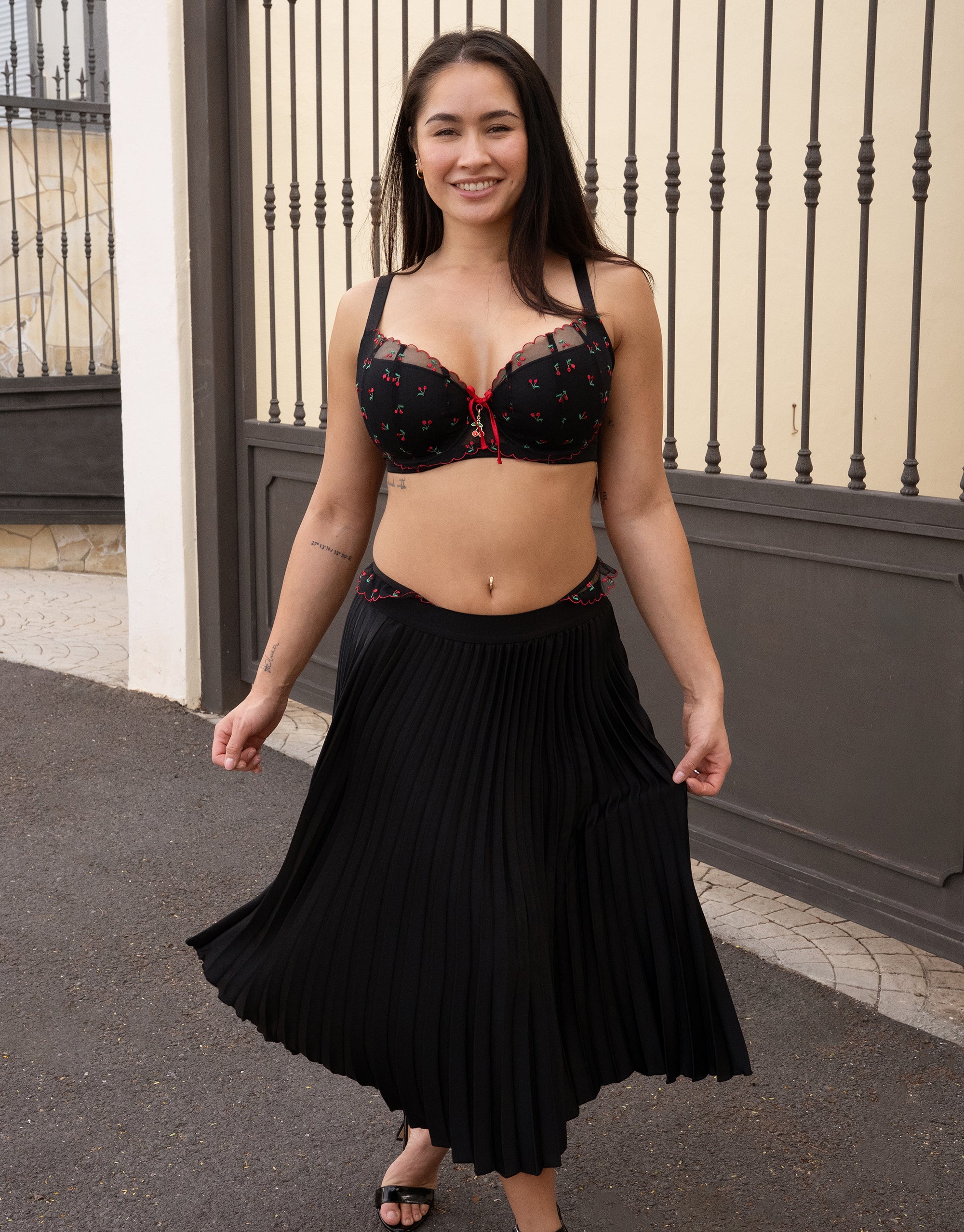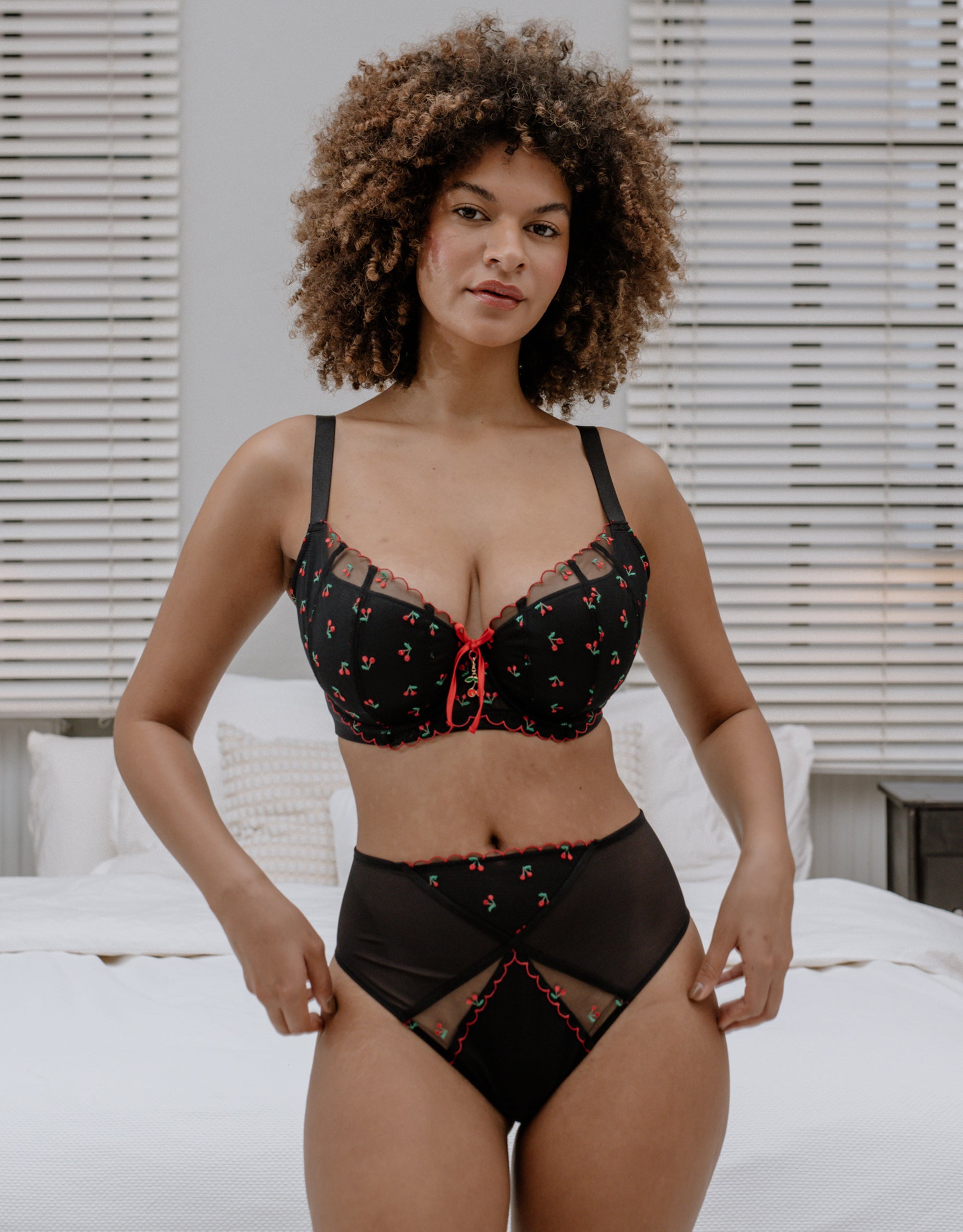 Freche und gleichzeitig feminine Akzente setzen die verspielte Schleife am Mittelsteg und die rot eingefasste Bogenkante. Auch die feinen Stickereidetails am Trägeransatz im Rücken greifen das Kirsch-Motiv wieder auf – Belle black cherry ist rundherum unwiderstehlich.