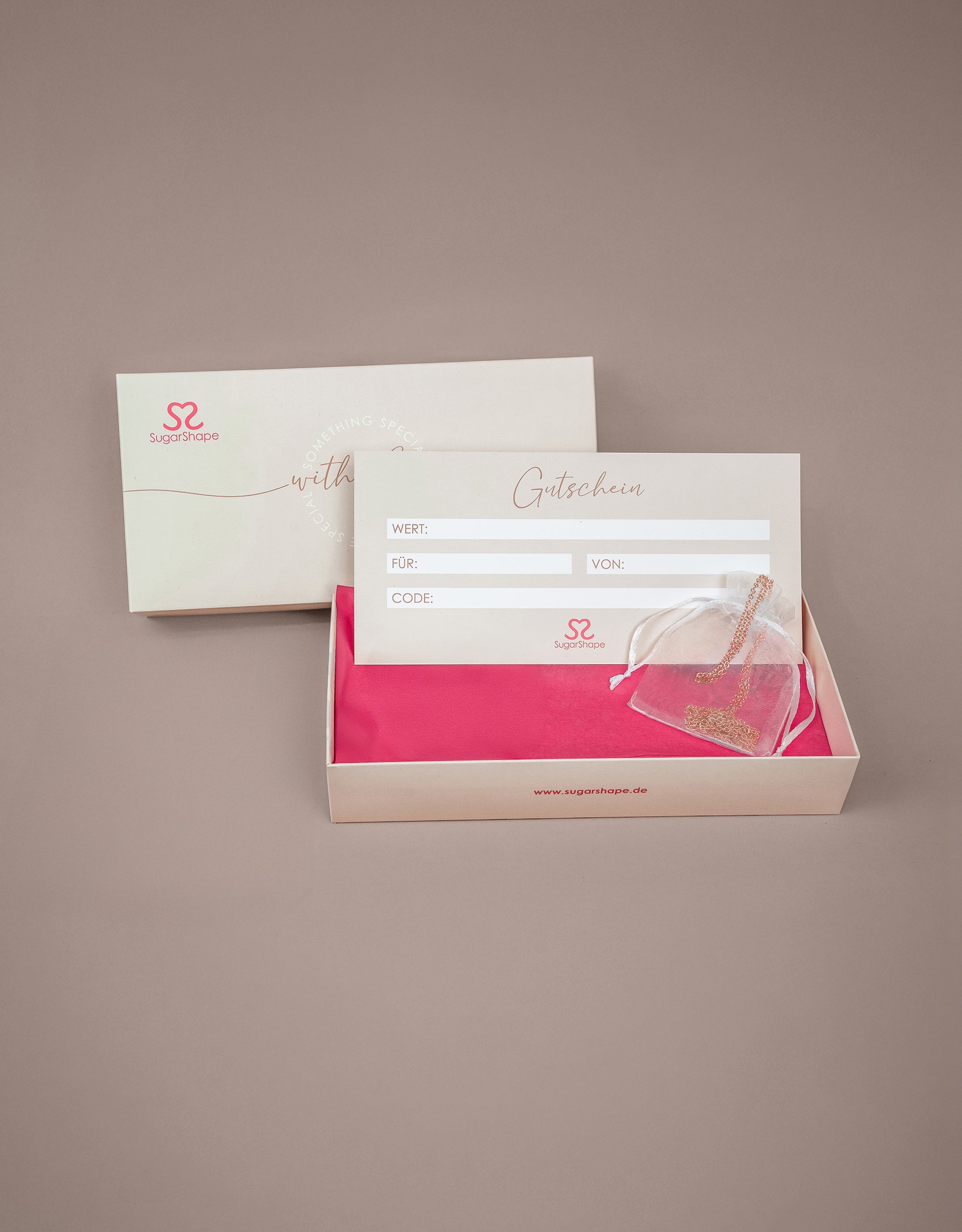 Neben dem Geschenk-Gutschein ab 50 € ist in diesem exklusiven Paket unsere zarte Bodykette in der Größe des Unterbrustbands 90+ (UVP: 19,99 €) kostenlos enthalten.