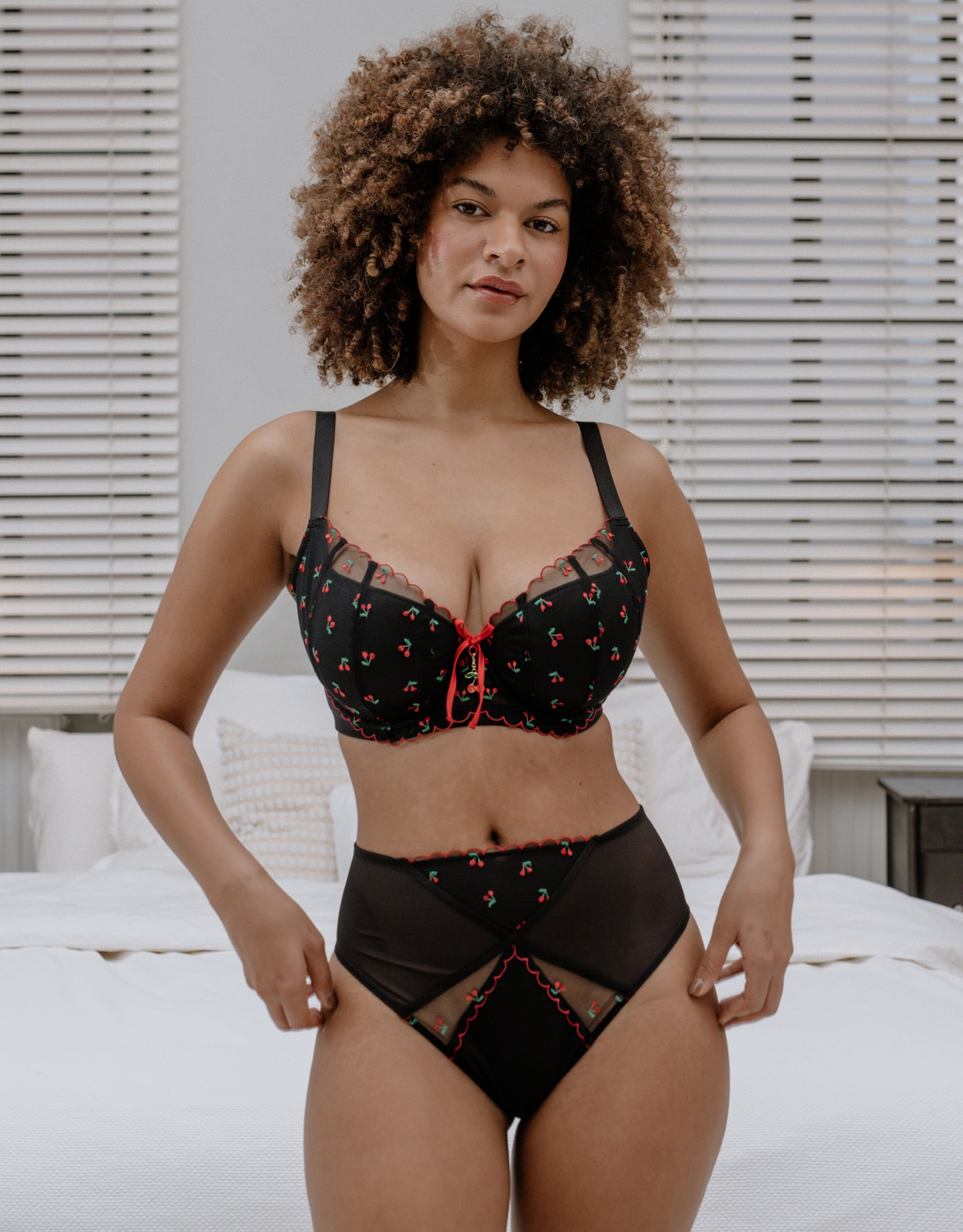 Der High-Waist-Brazilian Belle black cherry by Paula Lambert verbindet verspielte Kirschstickereien mit selbstbewusster Sinnlichkeit. Der hohe Bund und der hohe Beinausschnitt schmeicheln Deiner Figur und zaubern Dir lange Beine.