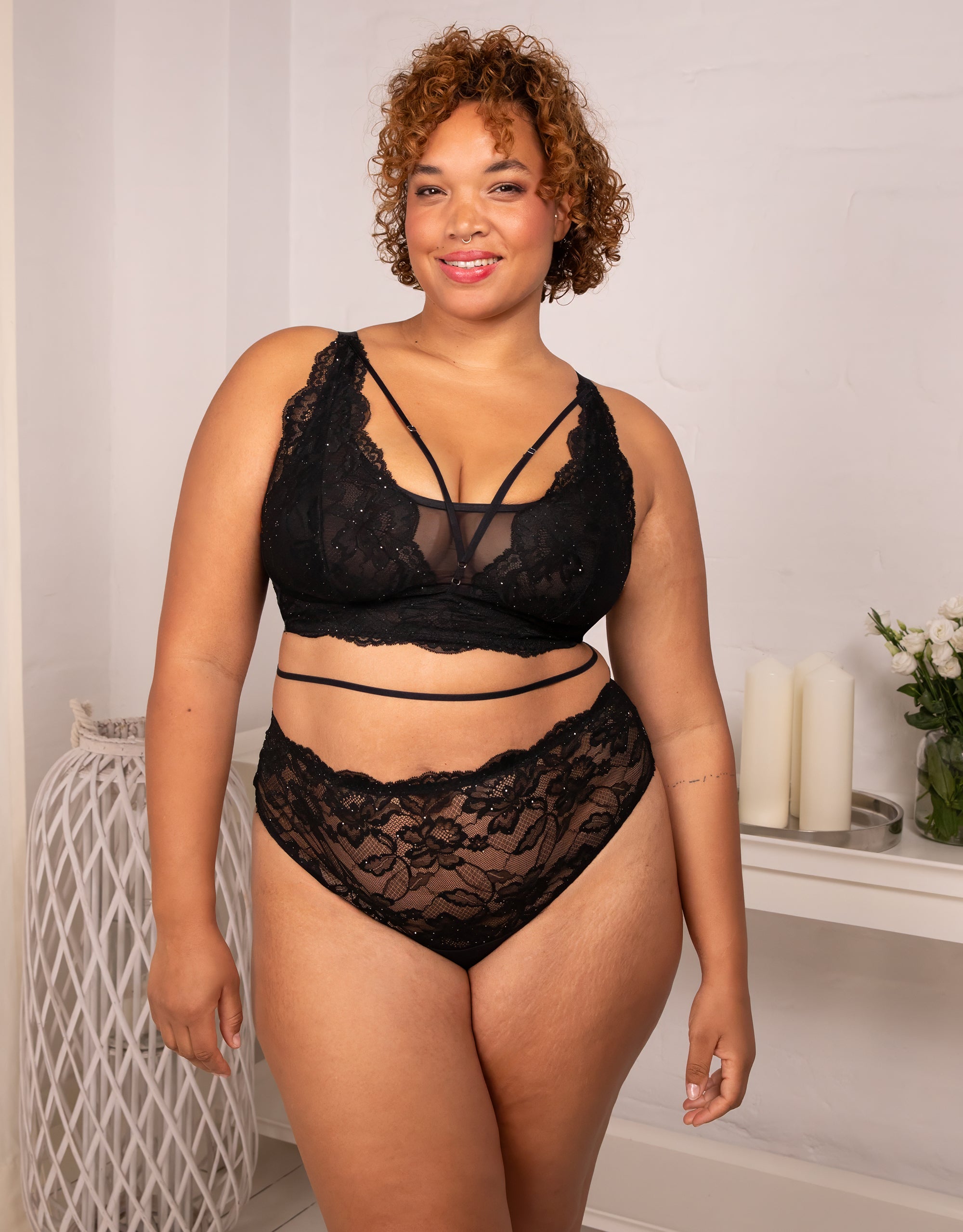 The High String Elva Glam in black stands for modern elegance with a sparkling finish. The transparent floral lace looks classy and light, while integrated mini sequins provide a subtle, luxurious glow.