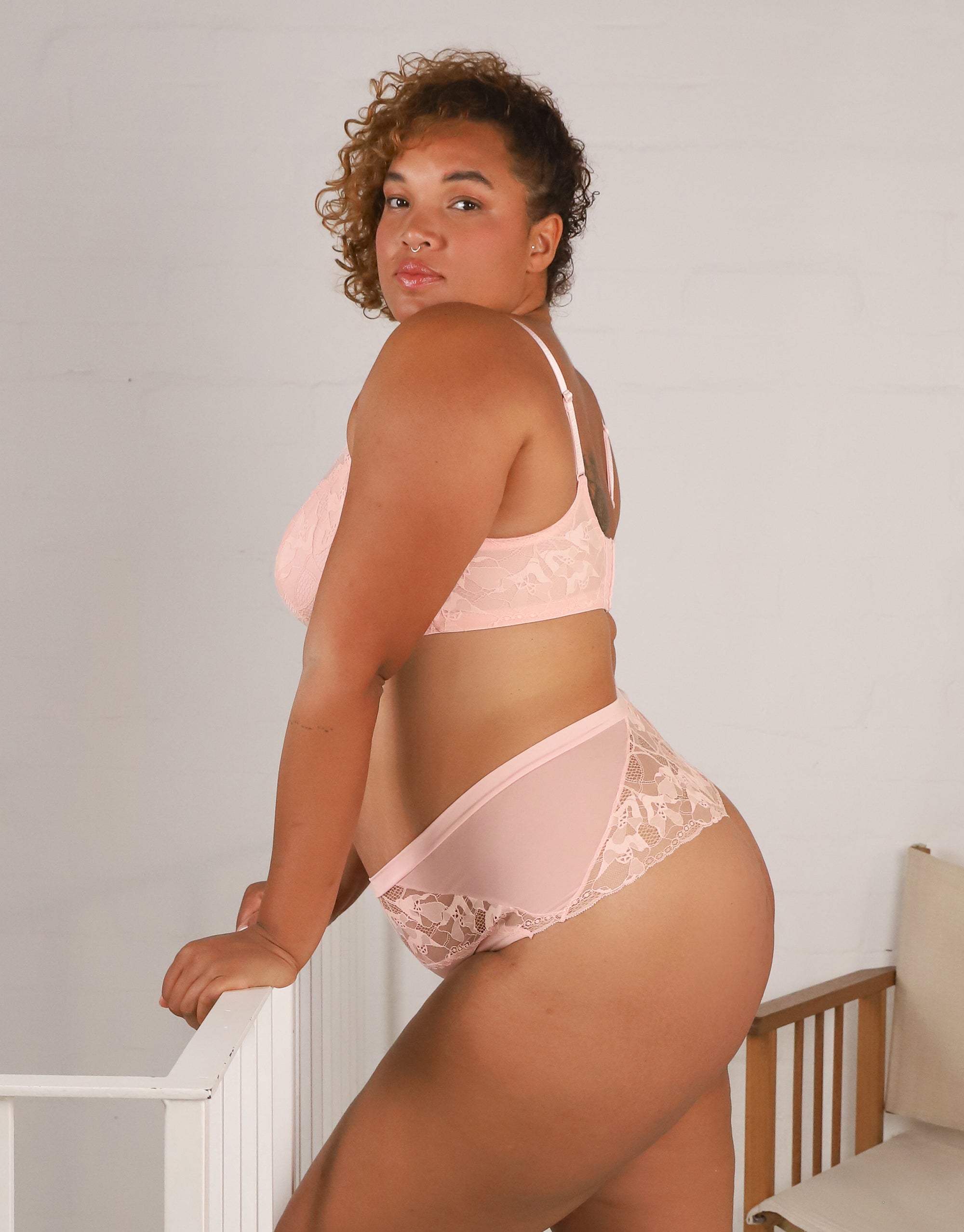 The Gracy high thong in blush captivates with its delicate lace and the silky sheen of the microfibre. The wide waistband sits comfortably and creates a smooth line, while mesh details on the sides and a transparent insert at the back complete the feminine look. For everyone who loves subtle elegance with a touch of seduction.